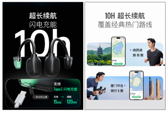 与入耳式耳机相比,骨传导耳机的一大优势在于开放式设计,让用户在享受音乐的同时,也能保持对环境音的感知。E-move 采用环境音智能增强技术,在跑步、骑行等场景下,用户可以清晰听到周围车辆鸣笛、行人呼喊等重要声音,提高户外运动的安全性。同时,对于日常通勤人群而言,开放式耳机设计能够避免地铁、公交报站信息遗漏,让日常出行更加便捷。