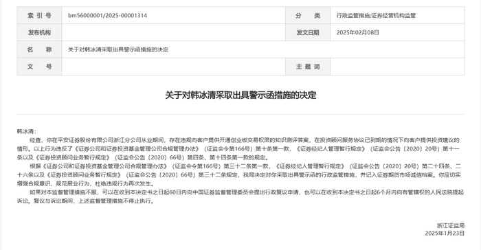 2月8日,浙江证监局对平安证券浙江分公司工作人员韩冰清开出罚单。该处罚文件显示,韩冰清在从业期间,存在违规向客户提供开通创业板交易权限的知识测评答案,在投资顾问服务协议已到期的情况下向客户提供投资建议的情形。浙江证监局决定对其采取出具警示函的行政监管措施,并记入证券期货市场诚信档案。