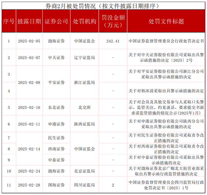 2月监管部门针对券商开出的罚单,数量虽少但力度不减。
