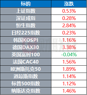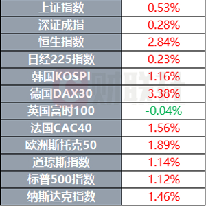 欧股主要指数收盘普涨,德国DAX30指数涨3.38%,法国CAC40指数涨1.56%,欧洲斯托克50指数涨1.89%。