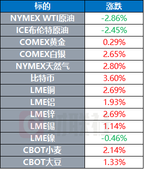 COMEX黄金期货收涨0.29%,报2929美元/盎司;COMEX白银期货收涨2.65%,报33.24美元/盎司。