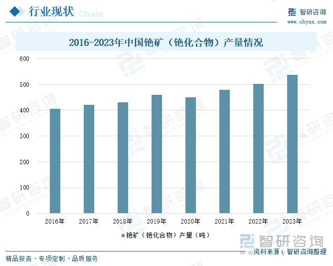 近年来,中国铯矿行业在开采和加工技术方面取得了显著进步。随着数字化智能化开采模式的推广,铯矿的开采效率和资源利用率大幅提升。此外,精密分离技术和高效能源利用技术的不断发展,进一步提高了铯化合物的生产效率和产品纯度。这些技术突破为铯矿产量的稳步增长提供了有力支持。2023年,中国铯矿(铯化合物)产量为537吨,同比增长6.76%。同时,伴随着铯及其化合物在多个领域的应用不断拓展,特别是在高科技领域,如原子钟、核能、半导体和光纤通信等,推动铯矿产量的不断攀升。