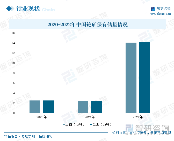 中国被认为拥有富含铯的间歇泉、锂云母和铯榴石矿床。根据自然资源部数据显示,2022年,中国铯矿保有储量为14.15万吨,同比增长473.00%。其中,江西省铯矿保有储量为14.07万吨,同比增长487.80%,占全国总保有储量的99.47%。