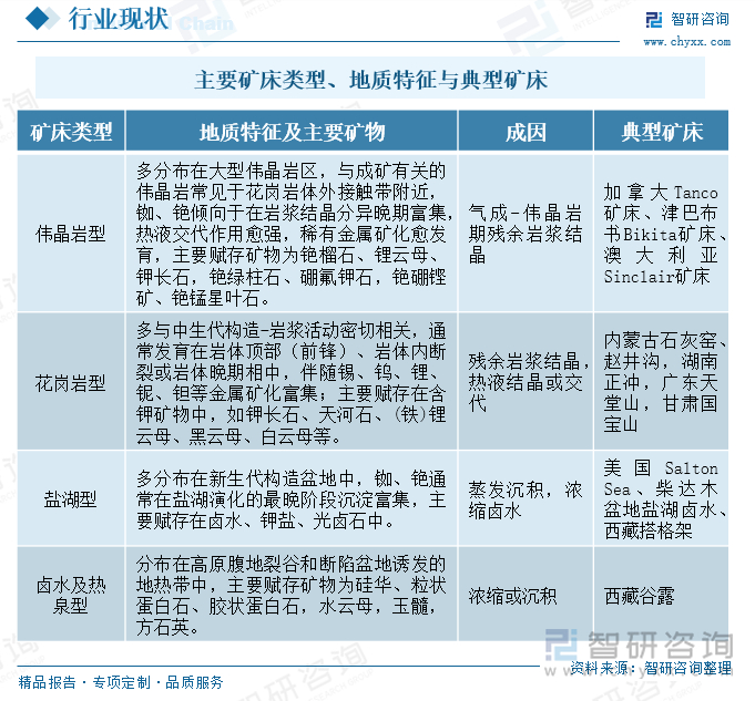 全球铯矿资源分布的地质成因复杂,主要包括残余岩浆结晶、热液交代以及卤水浓缩或蒸发沉积等过程。这些过程形成了不同类型的铯矿床,如伟晶岩型、花岗岩型、盐湖型和卤水及热泉型等。铯资源主要赋存于伟晶岩矿床中,这些矿床通常与锂、铍、铌、钽等稀有金属或盐类矿物共伴生。此外,卤水矿床也是铯资源的一种重要赋存状态,但相比伟晶岩矿床,开发利用价值有限。