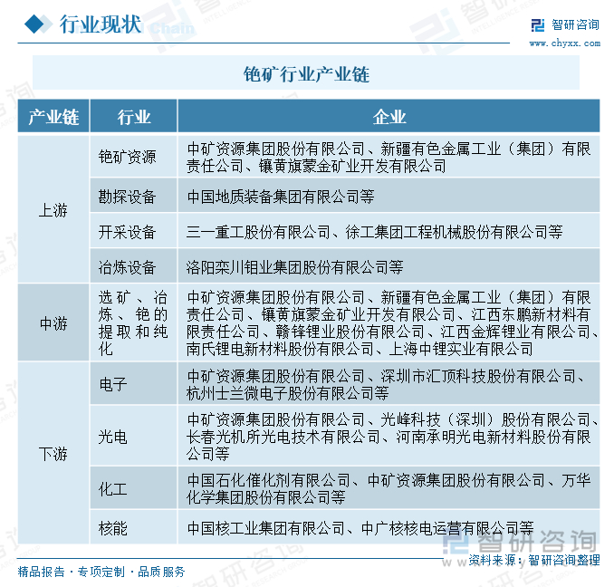 铯矿行业产业链上游主要涉及铯矿的开采及加工,包括铯矿资源以及勘探设备、开采设备和选矿设备等。产业链中游涉及铯矿的选矿、冶炼、铯的提取和纯化等。产业链下游为铯矿的应用领域,如电子、光电、化工、核能等。铯矿被转化为各种高附加值产品,如铯同位素、铯合金、铯化合物等,广泛应用于精密仪器制造、医疗诊断、能源开发等领域。