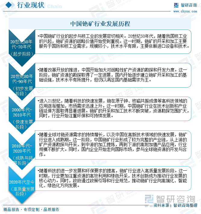 中国铯矿行业发展主要经历了五个阶段。20世纪50年代至70年代的起步阶段,中国铯矿行业的起步与核工业的发展密切相关。20世纪50年代,随着我国核工业的兴起,铯矿资源的战略价值开始受到重视。这一时期,铯矿的开采和加工主要服务于国防和核工业需求,规模较小,技术水平有限,主要依赖进口设备和技术。