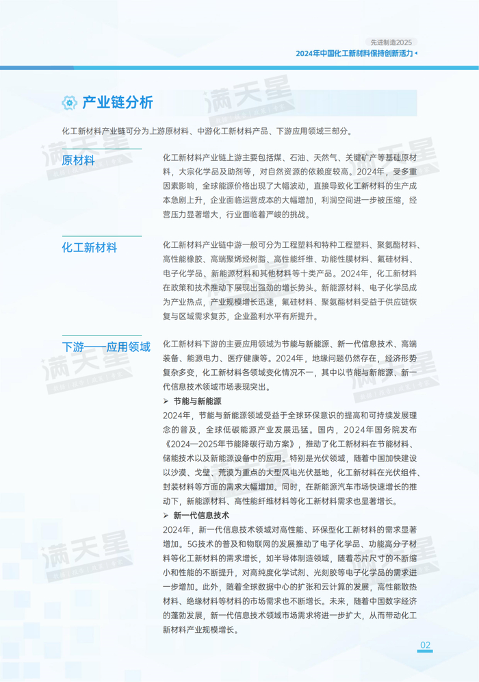 2024年,节能与新能源领域受益于全球环保意识的提高和可持续发展理念的普及,全球低碳能源产业发展迅猛。国内,2024年国务院发布《2024—2025年节能降碳行动方案》,推动了化工新材料在节能材料、储能技术以及新能源设备中的应用。特别是光伏领域,随着中国加快建设以沙漠、戈壁、荒漠为重点的大型风电光伏基地,化工新材料在光伏组件、封装材料等方面的需求大幅增加。同时,在新能源汽车市场快速增长的推动下,新能源材料、高性能纤维材料等化工新材料需求也显著增长。