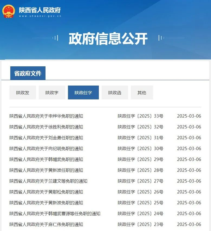 3月6日,陕西省人民政府网站发布一批人事任免通知。