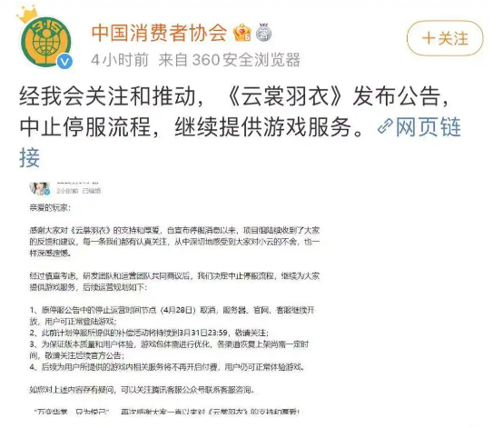 相比之下,《云裳羽衣》的案例则为玩家维权树立了成功的典范。2022年,《云裳羽衣》因发行商停运面临停服危机。面对这一困境,玩家通过工信部、中国消费者协会、黑猫投诉等平台反映问题,表达对停服的不满和对虚拟财产保护的诉求。最终,在中国消费者协会的关注推动下,《云裳羽衣》中止了停服流程,并继续为玩家提供游戏服务。这一案例为游戏行业敲响了警钟:玩家的权益不容忽视。