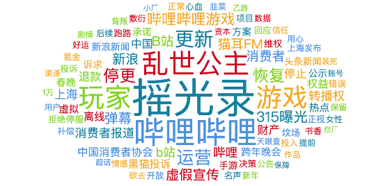 从关键词云可见,“摇光录:乱世公主”“玩家”“哔哩哔哩”等相关事件本身热词成为核心传播词;“投诉”“停更”“维权”“运营”“更新”“恢复”也侧面反应网友对该件事的态度。