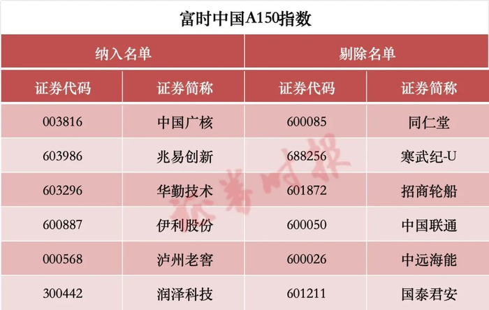 富时中国A150指数调入中国广核兆易创新泸州老窖等,调出同仁堂中国联通、寒武纪等。