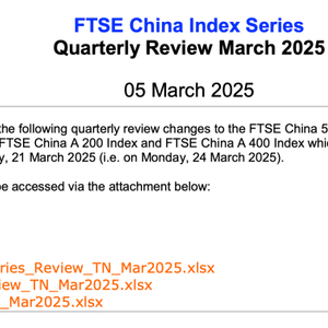 3月5日盘后,富时罗素宣布对富时中国50指数、富时中国A50指数、富时中国A150指数、富时中国A200指数、富时中国A400指数的季度审核变更。该变更将于3月21日(星期五)收盘后生效。