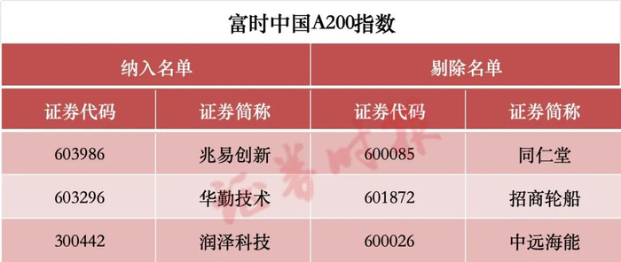 富时中国A200指数调入兆易创新华勤技术润泽科技,调出同仁堂招商轮船中远海能