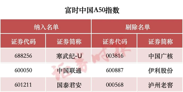 富时中国A50指数本次将纳入寒武纪、中国联通以及国泰君安。同时,富时中国A50指数本次将剔除中国广核伊利股份泸州老窖