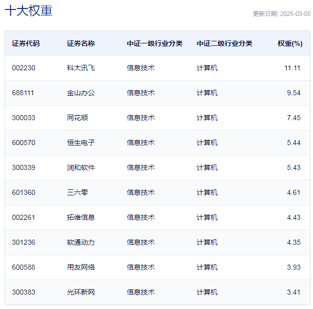 中证全指软件指数主要权重股