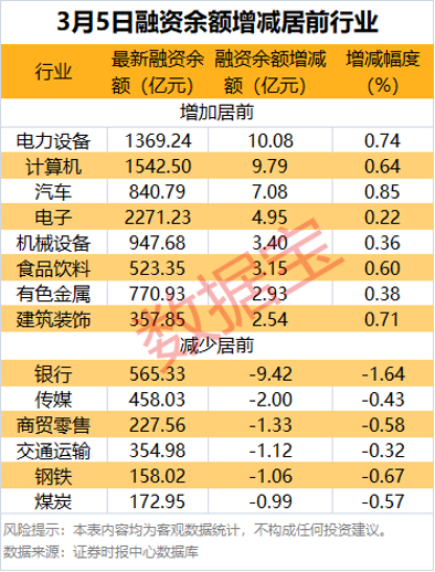 分行业统计,申万所属一级行业中,有20个行业融资余额增加,电力设备行业融资余额增加最多,较上一日增加10.08亿元;融资余额增加居前的行业还有计算机、汽车、电子等,融资余额分别增加9.79亿元、7.08亿元、4.95亿元。