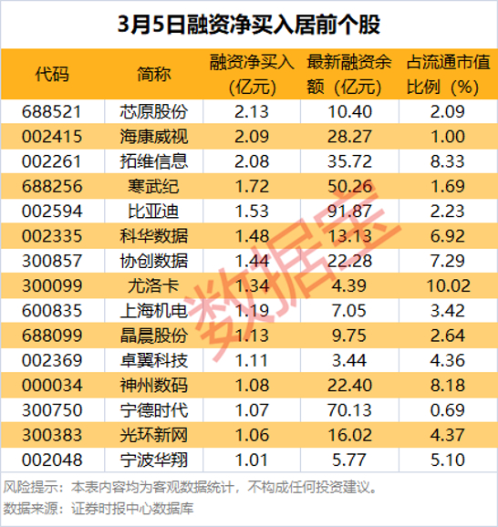 融资净买入金额居前的还有寒武纪、比亚迪、科华数据等。