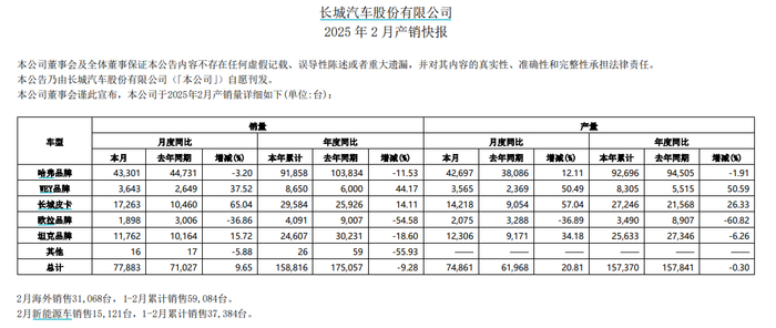 长城汽车(601633/2333)发布的销售快报显示,公司2月销量有增长,但是1-2月累计销量下降近一成。