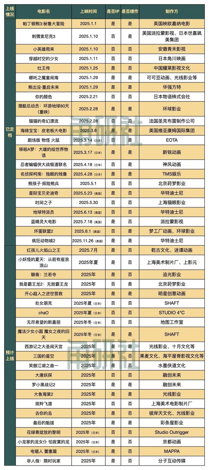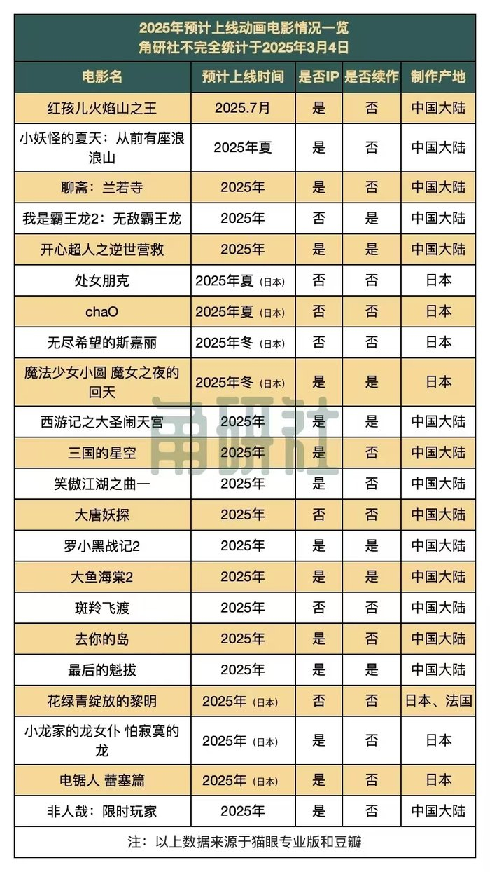 所以,角研社在介绍了《哪吒2》相关制作公司,相关IP授权合作伙伴,授权产品销售情况,以及近十年备案动画电影备案情况后,这篇稿件,我们统计了截至2025年3月5日,定档和官方透露计划在2025年上映的动画电影情况。