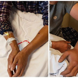 左图为用完血清恢复后;右图为刚入院时胳膊肿胀。图源:广州卫健委