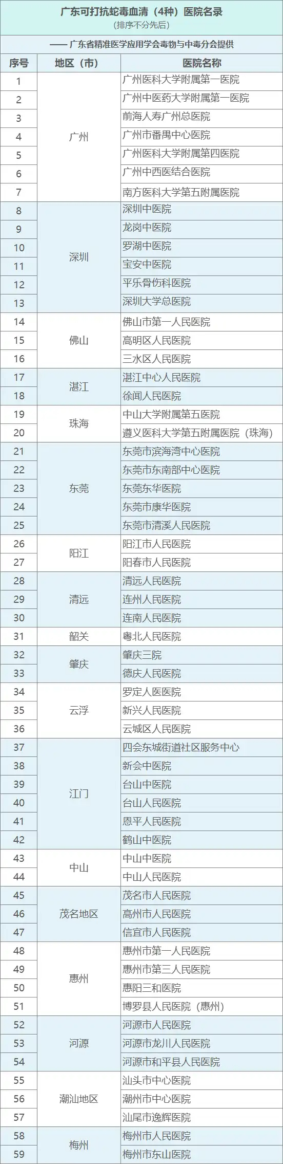 广东可打抗蛇毒血清医院名录(部分),以各医院实际情况为准↓↓