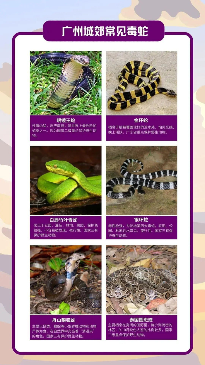 据统计,广东共有蛇类6科50属93种,其中毒蛇有33种,最为常见的有竹叶青蛇、银环蛇、眼镜蛇、眼镜王蛇、五步蛇等。