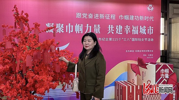 三月初的石家庄春寒料峭,却挡不住与会人员的热情。会场内洋溢着热烈庄重的气氛,门口一株鲜艳的“腊梅”吸引了记者的注意,枝头挂满了写有女同志们对幸福生活期待的“果实”,成为参会人员驻足留影的焦点。