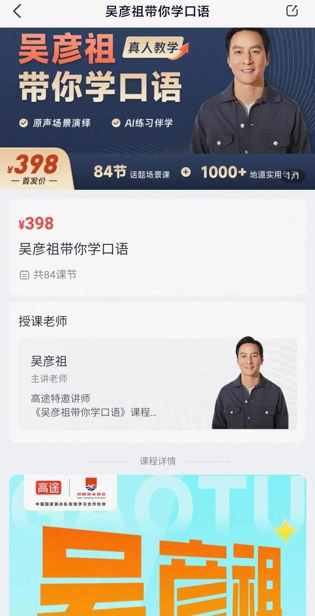此外,高途APP上线了“吴彦祖带你学口语”课程,首发价为398元,共有84节课,每节课8至10分钟。