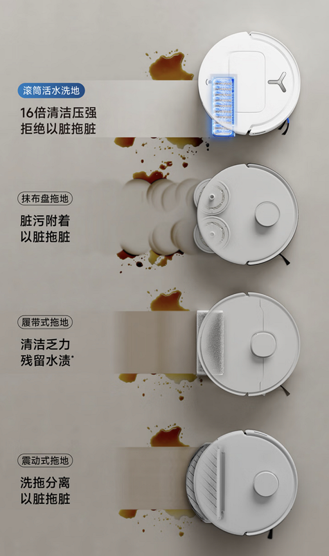 采用创新的OZMO Roller恒压活水洗地技术,滚筒式洗地与实时活水循环相结合,厨房重油污、客厅灰尘等顽固污渍都能轻松搞定。