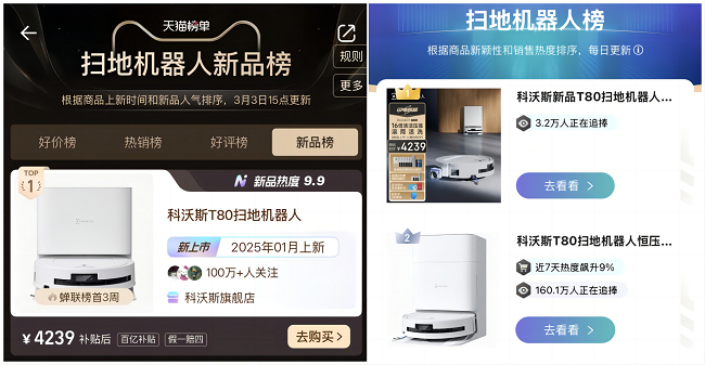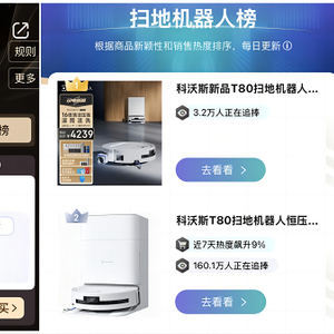 科沃斯连续10年中国市场销量第一,作为他们2025年推出的全新一代滚筒活水洗地机器人—地宝T80,开售仅1个月,就霸榜了2025年天猫扫地机器人新品榜,并连续3周蝉联榜首,而在2025年京东扫地机器人新品热卖榜,更是占据第一、第二和第九三个排名(不同店铺)。无论是清洁力、智能交互能力,都是标杆,目前官方旗舰店水箱版到手4239元,部分网店国补后仅需3319元,优惠力度大,十分值得入手。