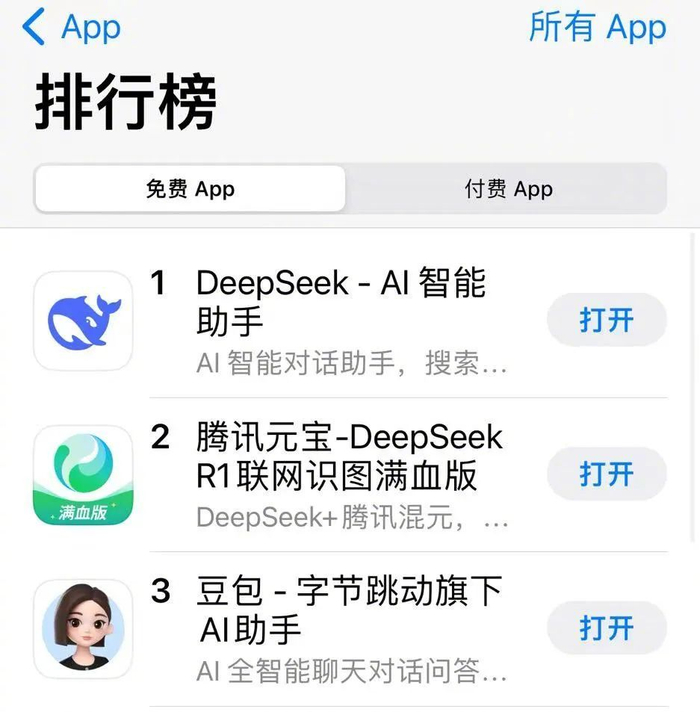 3月3日晚,腾讯元宝作为腾讯旗下AI助手,在中国区苹果应用商店免费App下载排行榜上的排名超过DeepSeek,升至榜首。在2月18日接入DeepSeek-R1模型后,腾讯元宝从“小透明”到登顶,只用了不足20天。