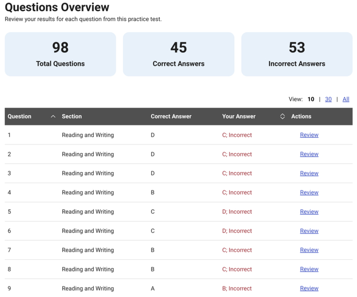 以往机考SAT模考网站成绩报告单,往往是对CB官方成绩单的简单复刻,但因为CB不公布机考SAT的算分规则,不公布成绩分析报告中每个模块的掉格规则,因此其它模考网站的成绩单,只能提供模仿CB的简答显示单题对错的页面,也无法提供各个模块的掉格情况的页面。