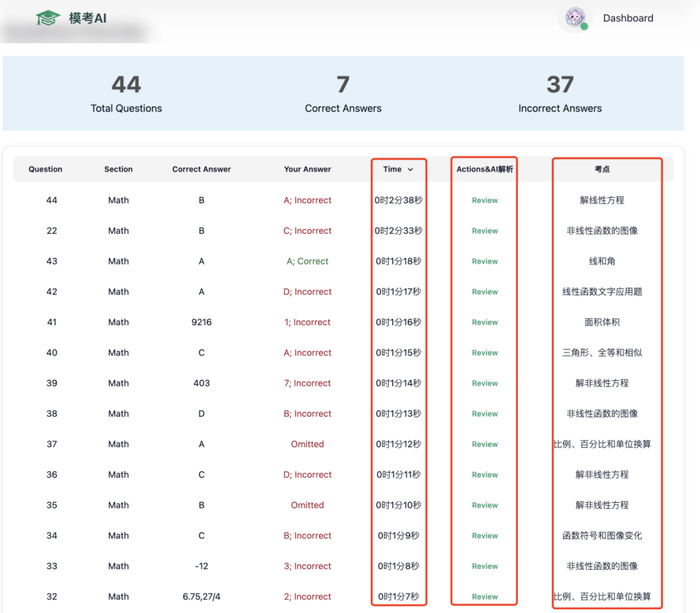 数学部分逐题用时、AI解析、知识点标注