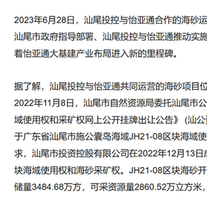2023年6月28日,双方联合运营的红海湾海砂项目正式开工。据相关报道,该项目海砂开采项目海域面积1.95万平方米,原矿资源储量3484.68万方,可采资源量达2860.52万立方米,出让年限2年2个月。