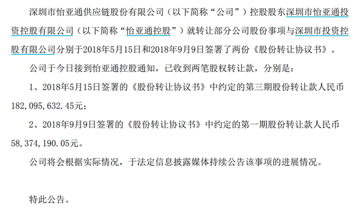 更早来说,怡亚通是有“前科”的。在2007年上市后,怡亚通经历了一段时间快速发展,同时也积累了较多的债务。2018年,怡亚通控股及公司实控人周国辉不得不引入国资,以解决现金流问题。据公告,怡亚通与深圳市投资控股有限公司(以下简称“深投控”)至少签署了两份《股权转让协议》。据公告,当年9月,深投控以5.50元/股受让怡亚通控股持有的怡亚通5%股份。交易完成后,深投控以18.3%的持股比例,超越怡亚通控股,成为第一大股东。