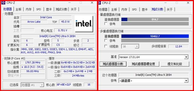 首先CPU-Z测试可以看到,它的单核得分为814.7,多核得分为10462.7,相比上一代酷睿Ultra 9 185H处理器来说,性能差异虽然不算太大,但能效差异非常明显。Ultra 9 185H需要90W功耗才能跑到Ultra 9 285H的性能水准。