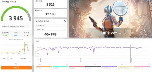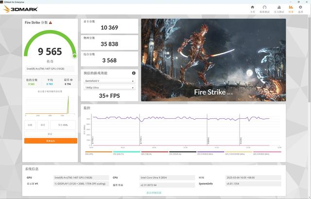 酷睿Ultra 200H系列处理器的核显主要包含锐炫140T和锐炫130T两个型号,酷睿Ultra 9 285H集成了锐炫140T核显。3DMark Time Spy和Fire Strike测试分别得分3525和10369分,与Ultra 200V系列的锐炫核显性能相仿,但是比酷睿Ultra 9 185H的GPU性能要强一些,080p游戏平均帧数提升了22%。