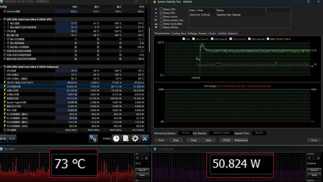 英特尔酷睿处理器的单核性能一直以来都处于行业领先地位,全新的酷睿Ultra 200H系列也不例外。这次使用的测试平台是一款轻薄本,满载功耗给到了50W,核心温度为73℃。