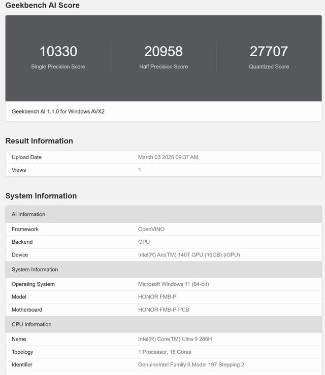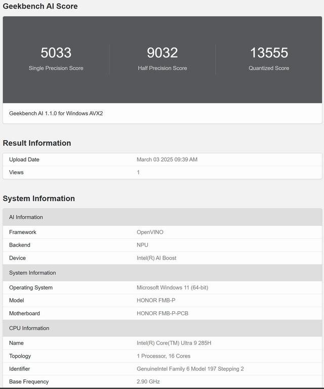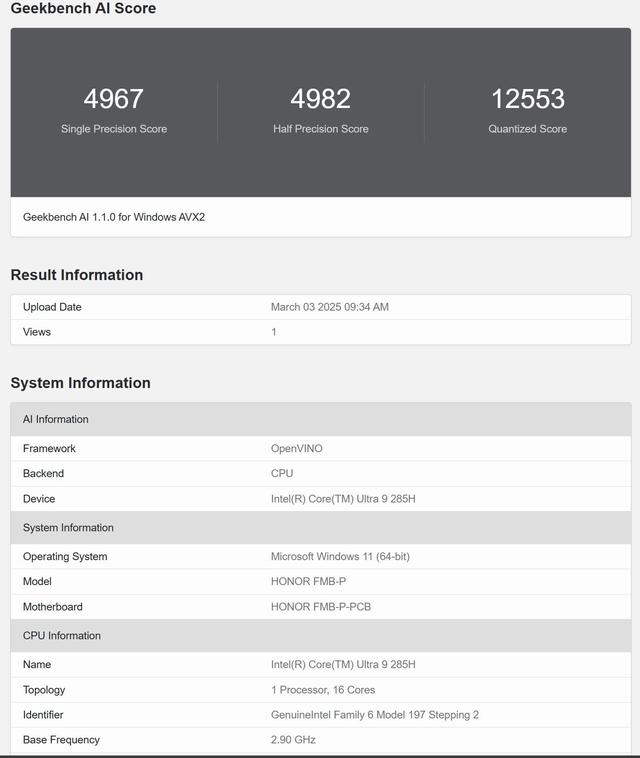 首先我们来看看GeekBench AI对于酷睿Ultra 9 185H AI算力的评估。