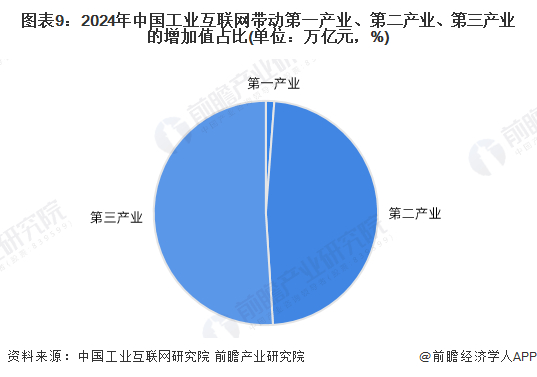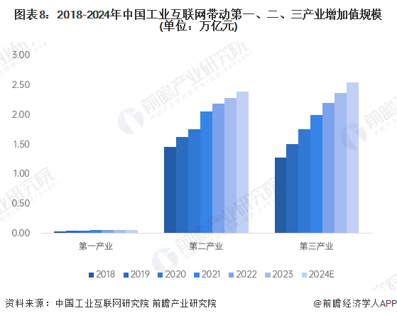 根据中国工业互联网研究院数据,预测2024年,工业互联网带动一、二、三产业的增加值规模将分别达到0.06万亿元、2.39万亿元、2.55万亿元。