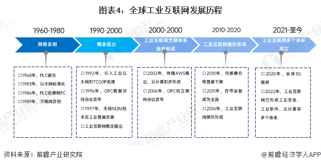 全球工业互联网发可分为5个阶段;第一阶段是在20世纪60-80年代,实现了网络的发明以及机器和机器之间的互联;第二阶段是在20世纪90年代,实现了工业网络协议以及操作系统的发布,以及物联网的提出并且工业设备逐渐联网;第三阶段是在2000年初,云计算以及通信独立架构协议的形成,并且工业互联网支撑体系逐步形成;第四阶段是2010年到2020年,工业互联网雏形形成逐步形成;第五个阶段是2020年至今,2020年5G商用时代开启,工业互联网进一步发展,形成工业安全、工业软件、云计算等多个体系。