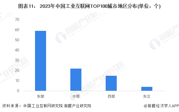2024年6月,中国工业互联网研究院发布了《全国主要城市工业互联网发展指数报告》,测算了全国332个地级行政区(不包括海南省三沙市;以下统称为城市)工业互联网产业增加值。根据研究院披露的数据,排名TOP100的城市集中在东部和中部地区,其中东部59个,中部22个,西部和东北分别分布15个和4个城市。其中江苏、广东、山东省城市数量最多,分别为13、11、11。