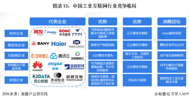 从软件企业来看,工业互联网主要代表企业有用友、东方电信等,以Saas服务转型为战略目标。在制造业企业中,以三一重工、海尔等企业为代表,其优势是熟悉生产制造流程但云计算技术较为薄弱;在互联网企业,以BAT为代表,虽然云技术领先但是缺乏专业和全面的工业知识;在系统解决方案服务商方面,华为和宝信软件等带领行业可以制造企业提供基础设施、平台、应用服务等整体信息化服务,但云计算技术稍弱;此外,初创企业以昆仑数据、树根互联等代表企业为主,其领域专注度高,创始团队通常来自头部信息科技和工业企业,但资金实力较弱。
