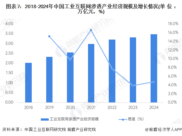 根据中国工业互联网研究院测算,2023年我国工业互联网渗透产业增加值为3.22万亿元,初步统计2024年我国工业互联网渗透产业增加值达到3.48万亿元,同比增长4.7%。