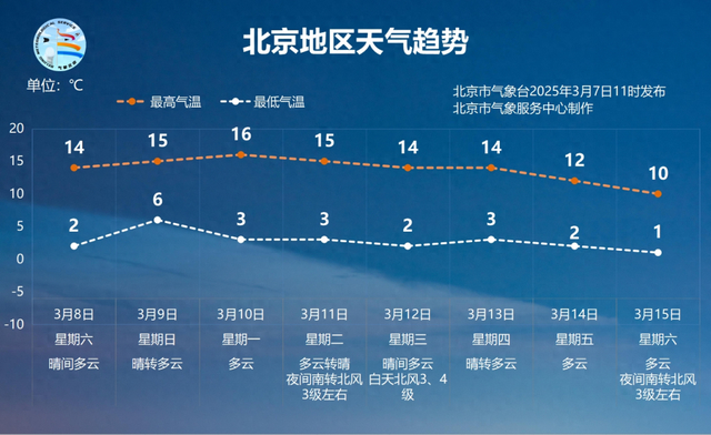 9日(周日)白天:晴间多云;北转南风2、3级;平原地区最高气温15℃,山区最高气温11~15℃。