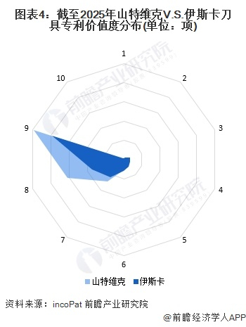 从专利价值度来看,山特维克在高价值专利(价值度为8-10)的绝对数量上领先,尤其是在价值度为9和10的专利数量上占据优势,显示出其在高价值专利布局上的显著优势。伊斯卡则通过较为均衡的专利分布,在整体专利质量上表现出较高的竞争力。两者各自展现了不同的专利战略,山特维克专注于高价值专利的积累,而伊斯卡则注重全面提升专利的质量和覆盖面。