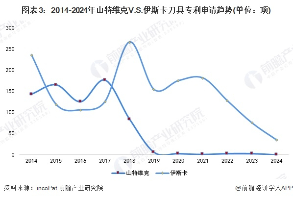 总体来看,2015-2017年间山特维克在专利申请数量上保持了较强的优势,但自2018年后,山特维克的研发活跃度明显下降。而伊斯卡在近几年逐步提升专利申请量,特别是在2018年之后,显示出其在刀具领域的研发力度逐年增加,并在个别年份实现了较大的突破,表明其技术研发水平逐步提升,竞争力增强。