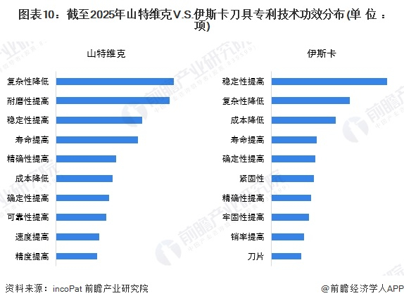 在刀具领域的专利技术功效表现上,山特维克与伊斯卡展现出不同的侧重点。山特维克的技术功效主要聚焦于“复杂性降低”、“耐磨性提高”和“稳定性提高”等方面,反映出其在刀具技术简化和提升产品寿命方面的强大技术积累,注重设备的长期稳定性和性能优化。相比之下,伊斯卡的技术功效则更加专注于“稳定性提高”、“复杂性降低”和“成本降低”等领域,表明其在优化技术复杂性和提升性价比方面的创新,注重刀具产品的成本控制与智能化应用,强调在市场中获得竞争优势。总体来看,山特维克的技术功效布局更为广泛,侧重于设备的综合性能优化;而伊斯卡则专注于技术简化、稳定性提升与成本控制,更加关注提升产品的性价比和适应市场需求。
