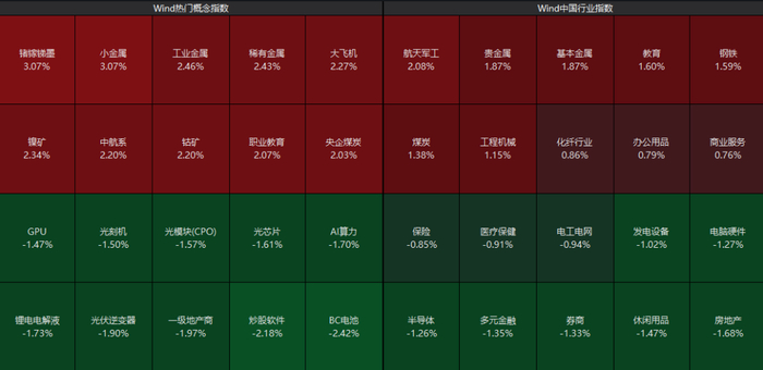 板块上来看,有色金属概念股开盘活跃,小金属、基本金属、贵金属等概念股强势走高,航天军工教育、煤炭等板块走强;而房地产、券商、半导体板块震荡调整。