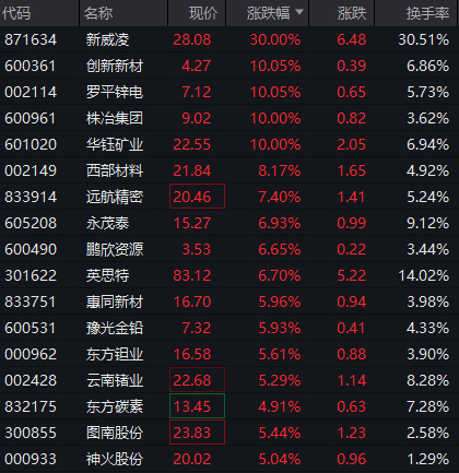 有色金属概念股开盘活跃,小金属、基本金属板块强势走高,新威凌30CM涨停,创新新材罗平锌电华钰矿业金瑞矿业等多股涨停。